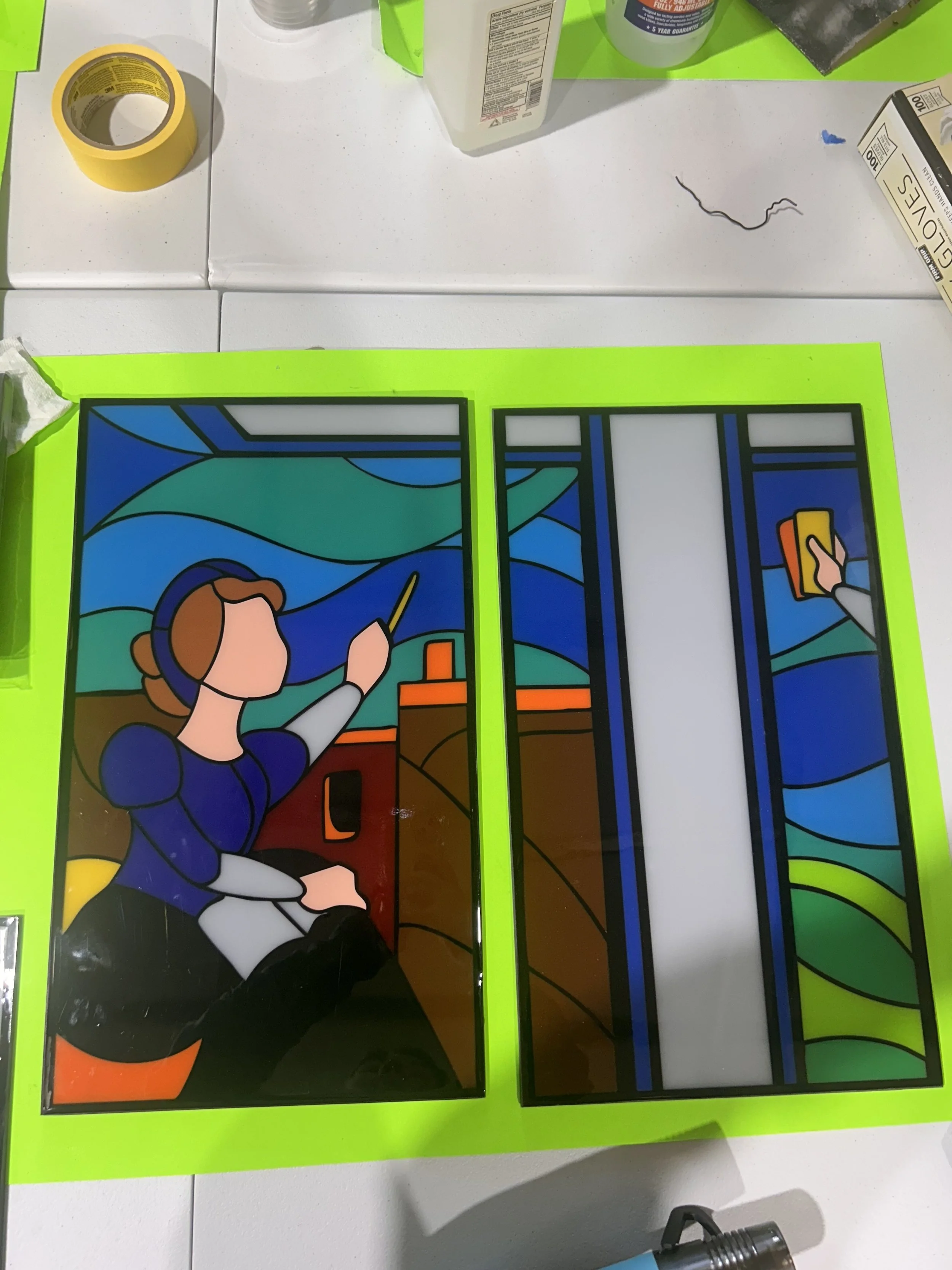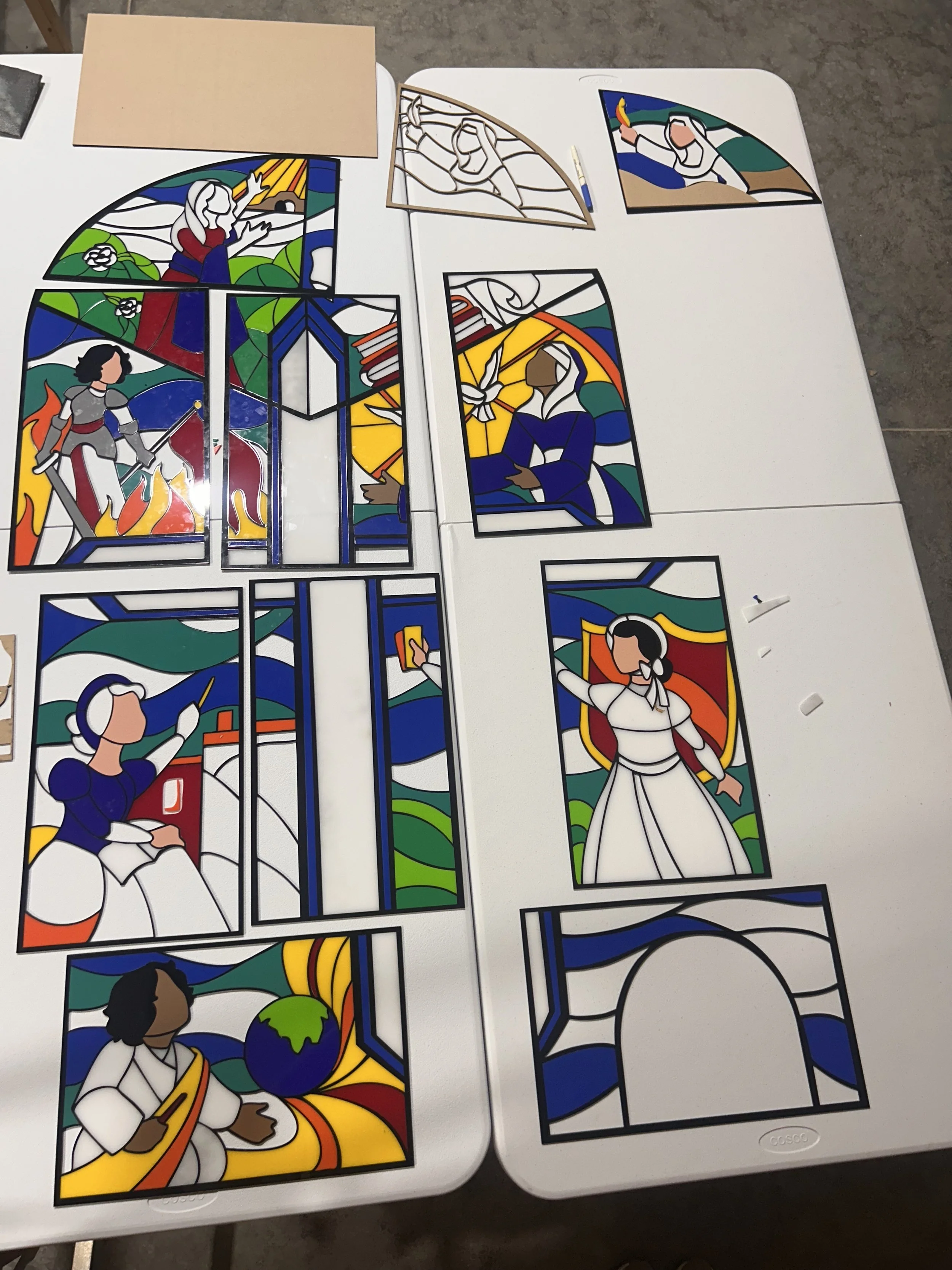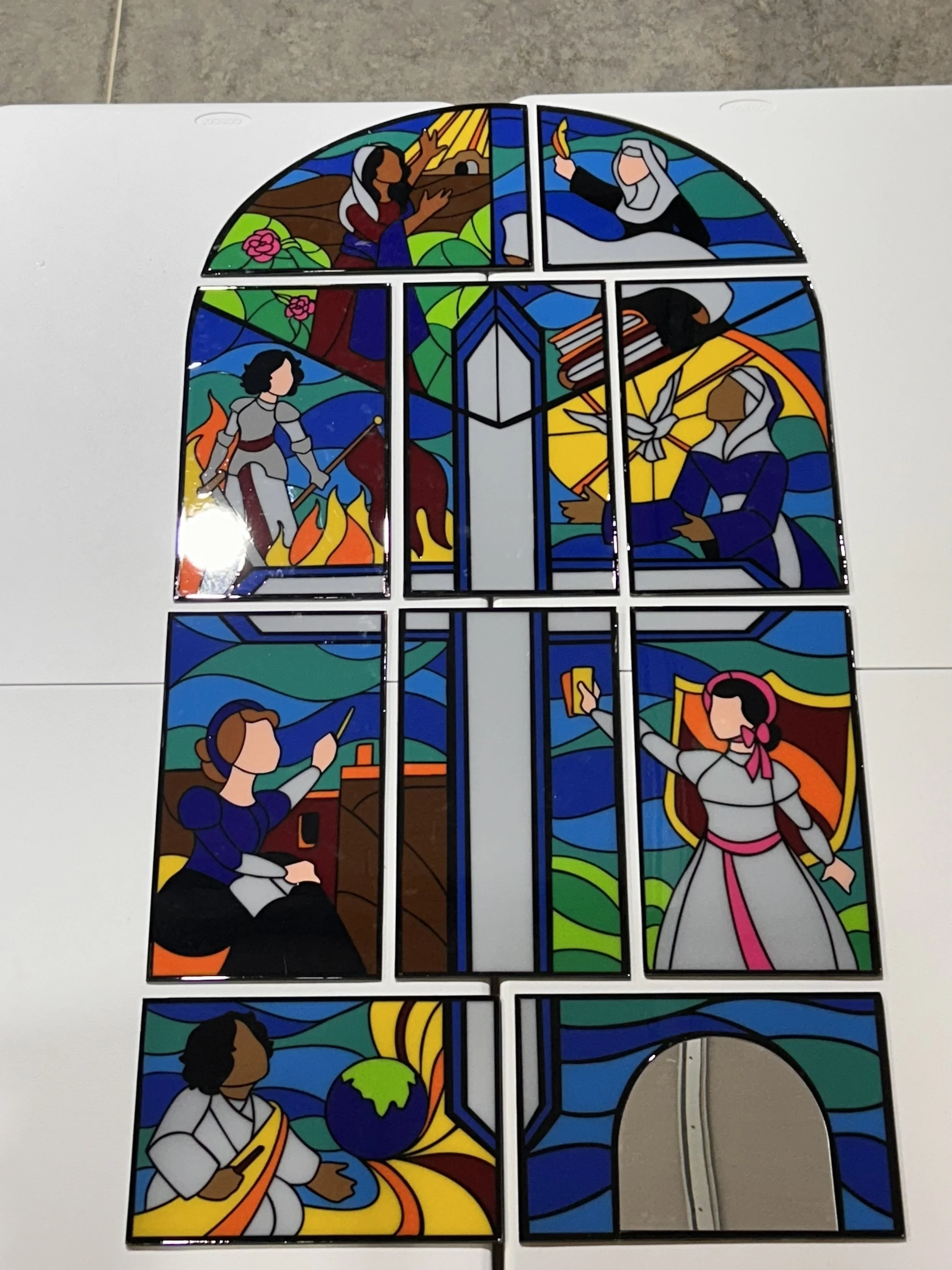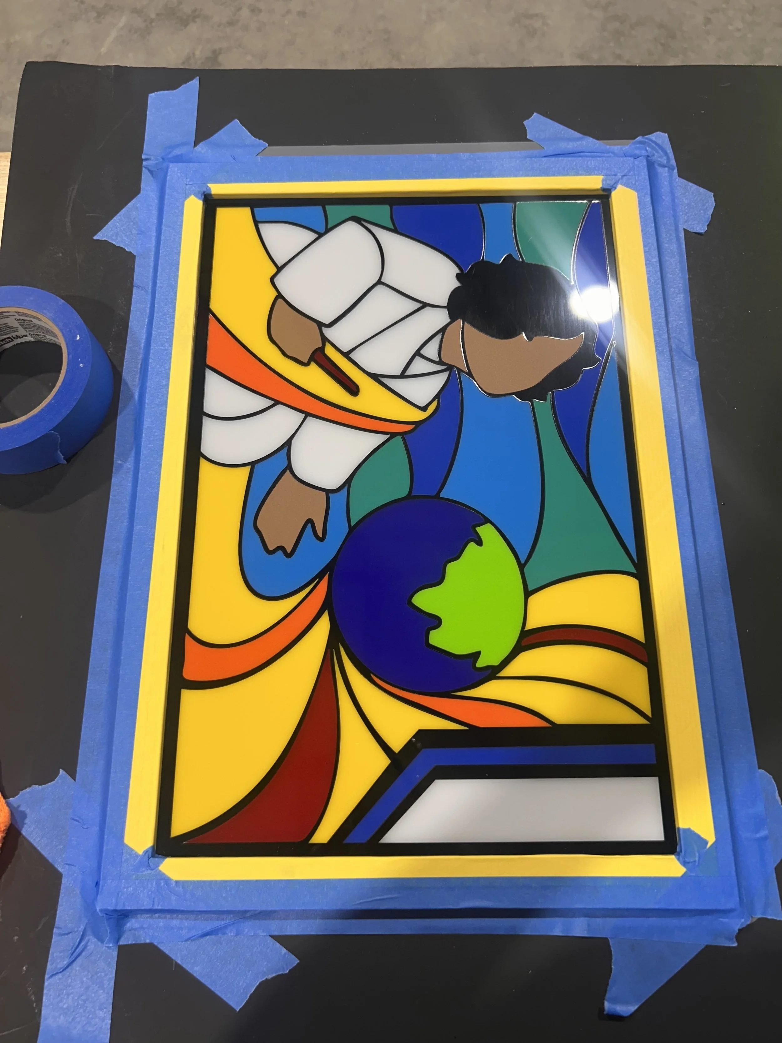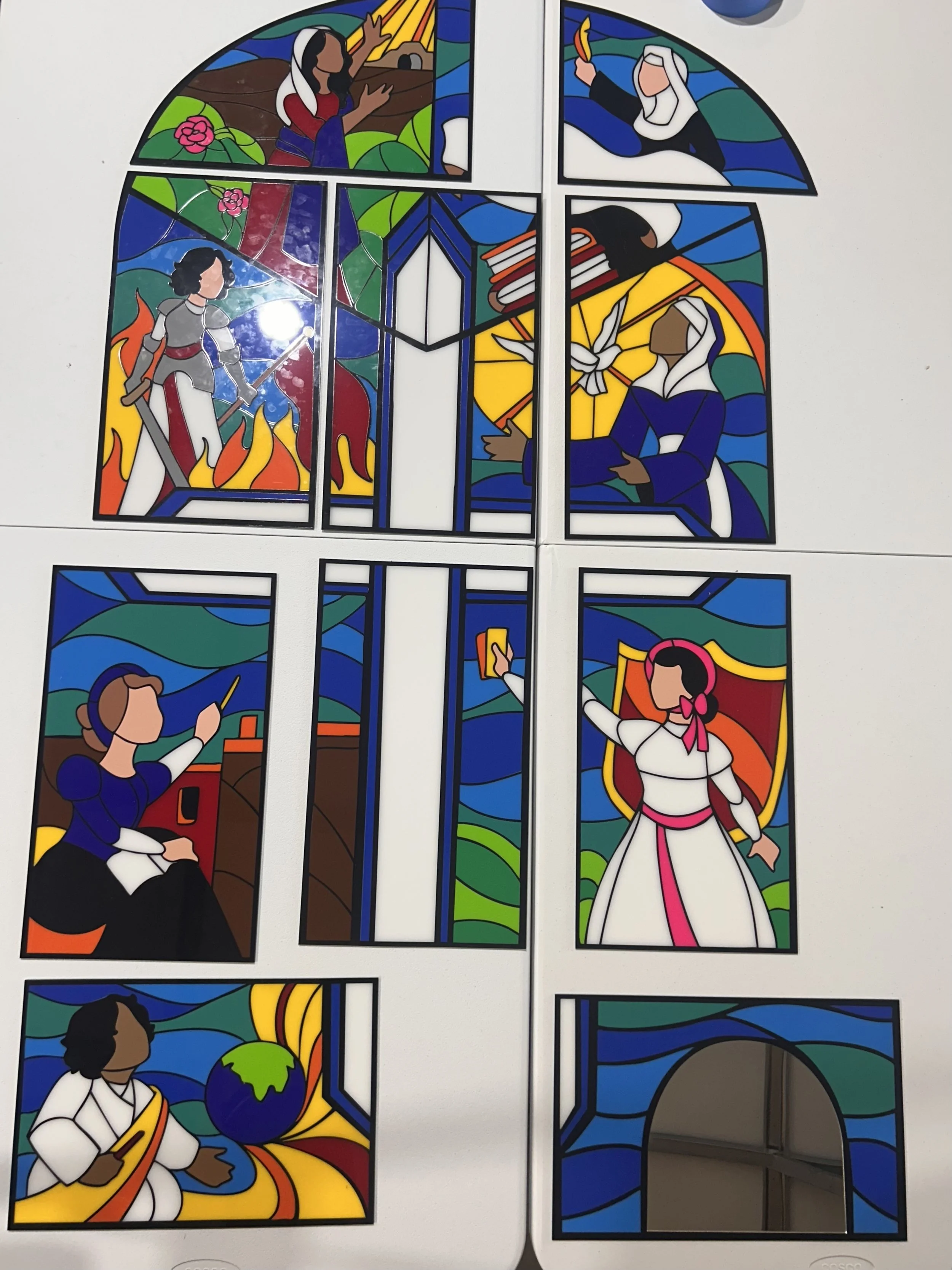 I chose to create my faux stained glass frame with acrylic and epoxy resin to bring the timeless artistic practice of stained- glass imagery into the current age with mediums that modern audiences were familiar with. Additional tools and materials used in this project, including a laser printer and software such as Procreate and Illustrator, are so current, this project could not have been produced before the past decade. However, shape language, design, and patterns of stained glass have been essential to the medium since its inception. Bringing these elements together were representative of the synthesis of our foundational matriarchs paired with the modern church to create something new, beautiful, and meaningful.