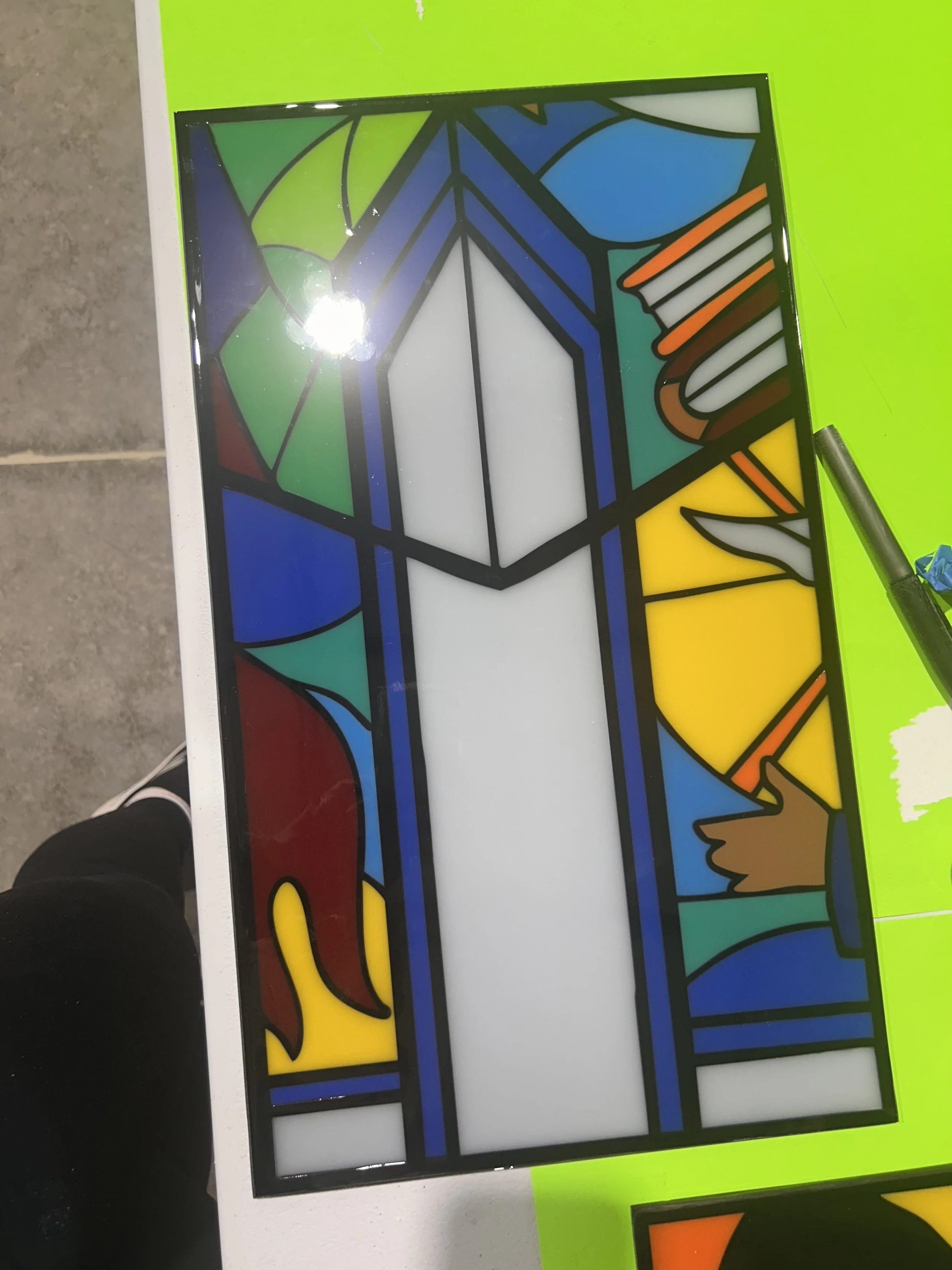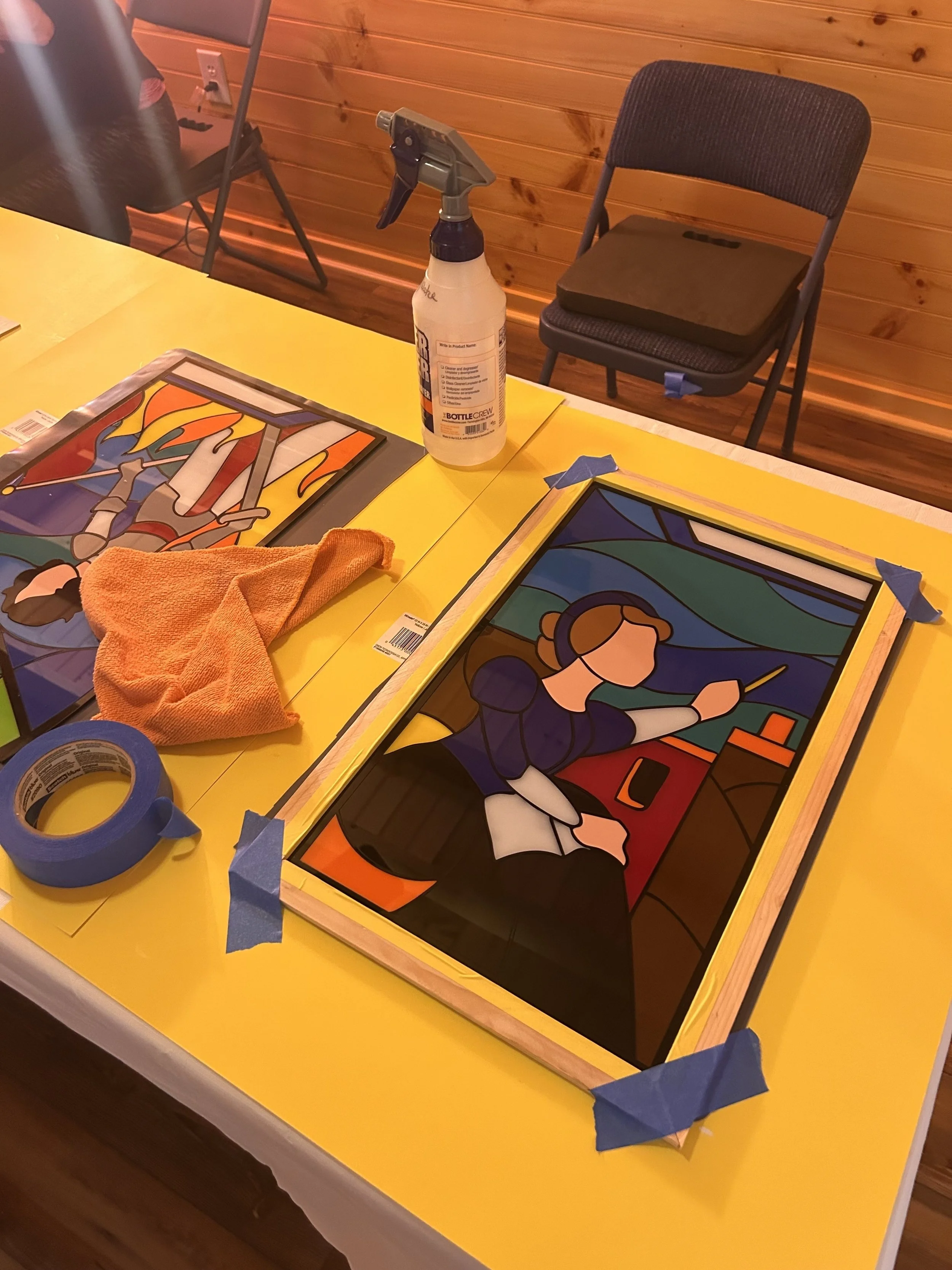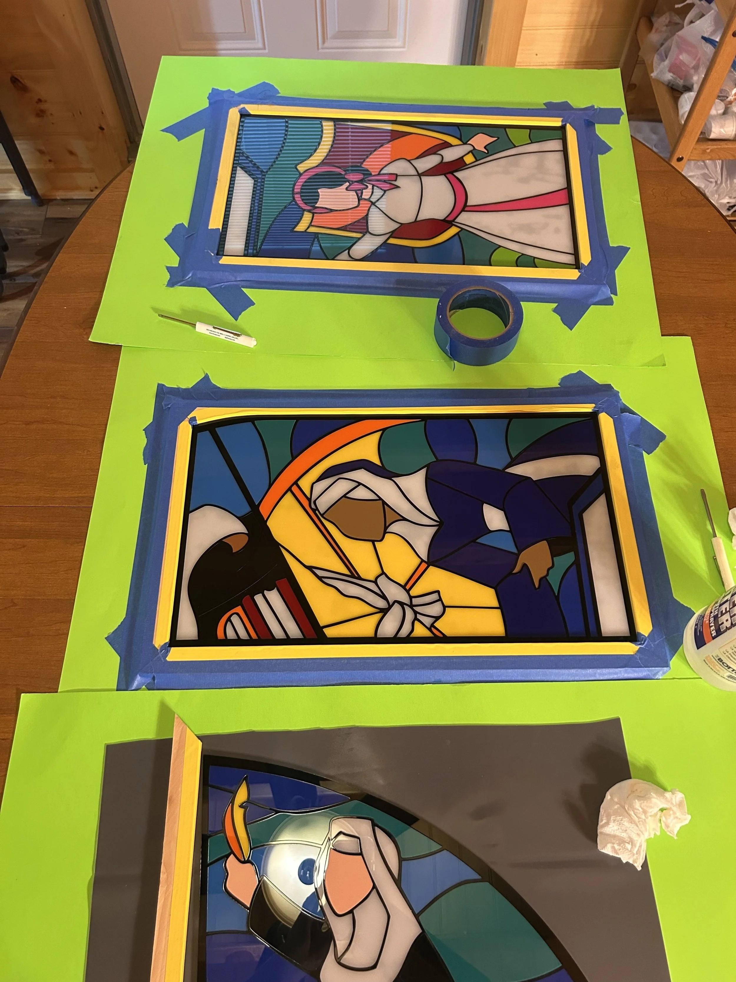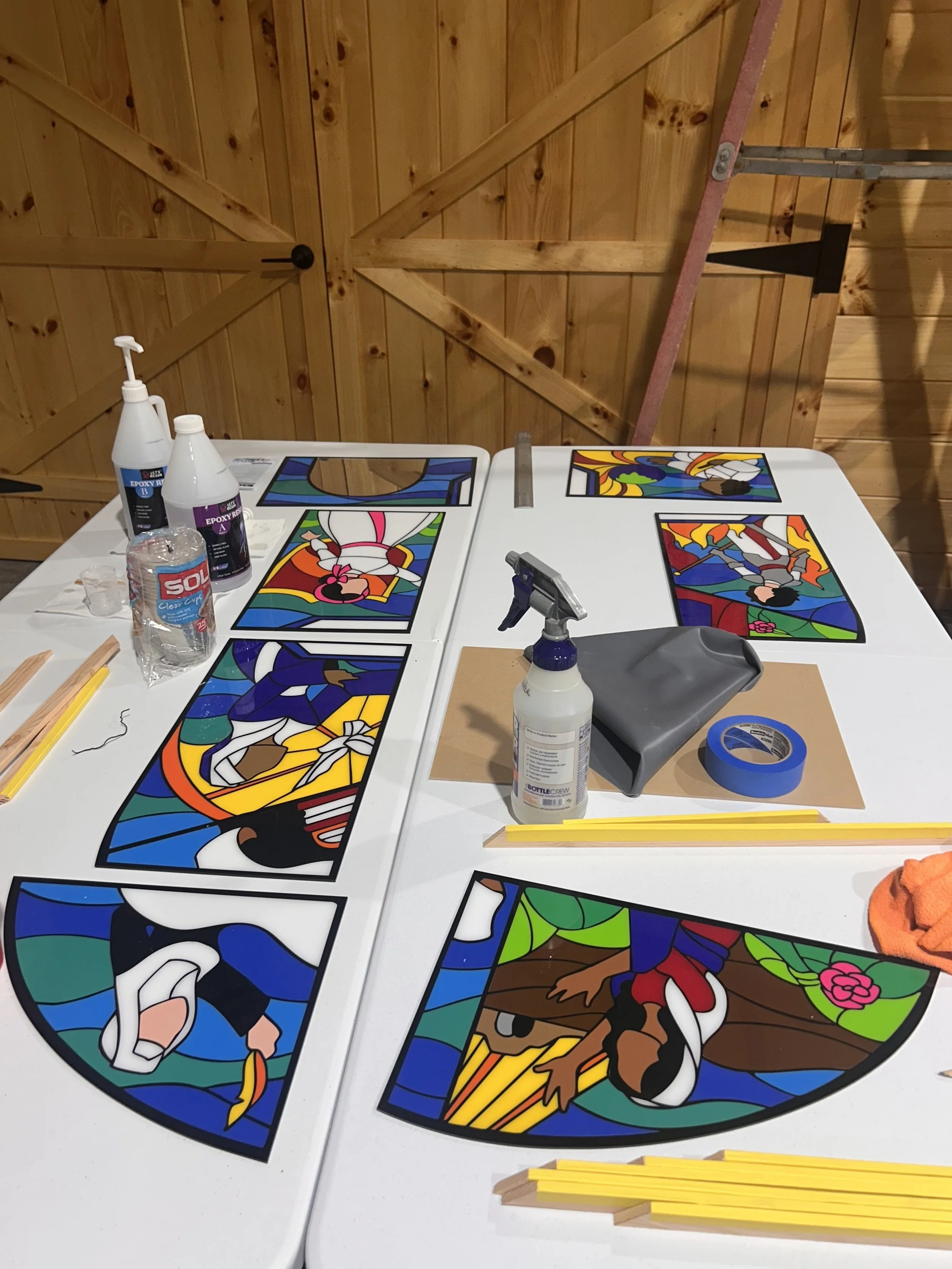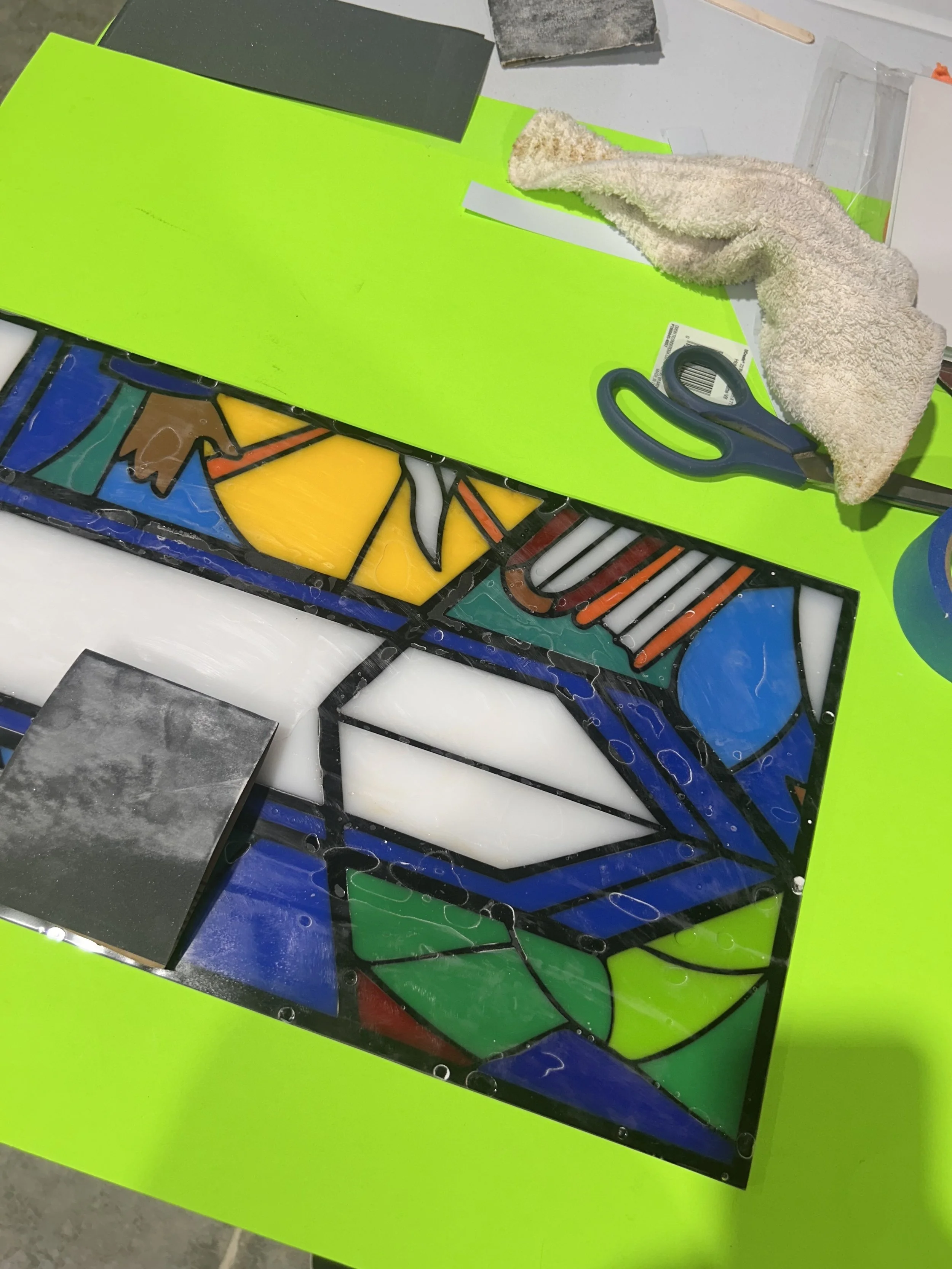 I chose to create my faux stained glass frame with acrylic and epoxy resin to bring the timeless artistic practice of stained- glass imagery into the current age with mediums that modern audiences were familiar with. Additional tools and materials used in this project, including a laser printer and software such as Procreate and Illustrator, are so current, this project could not have been produced before the past decade. However, shape language, design, and patterns of stained glass have been essential to the medium since its inception. Bringing these elements together were representative of the synthesis of our foundational matriarchs paired with the modern church to create something new, beautiful, and meaningful.