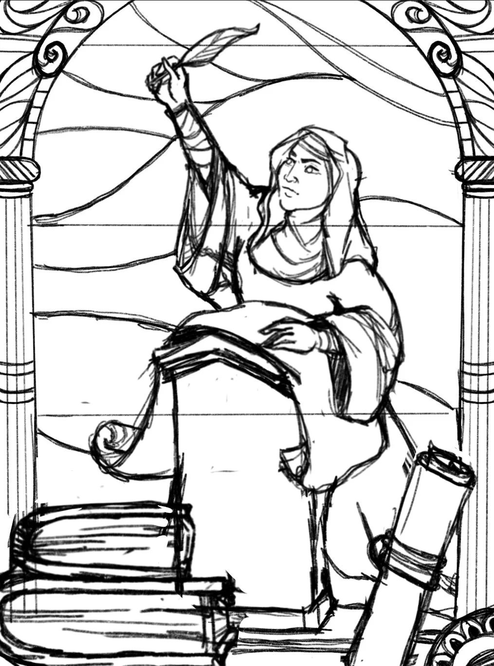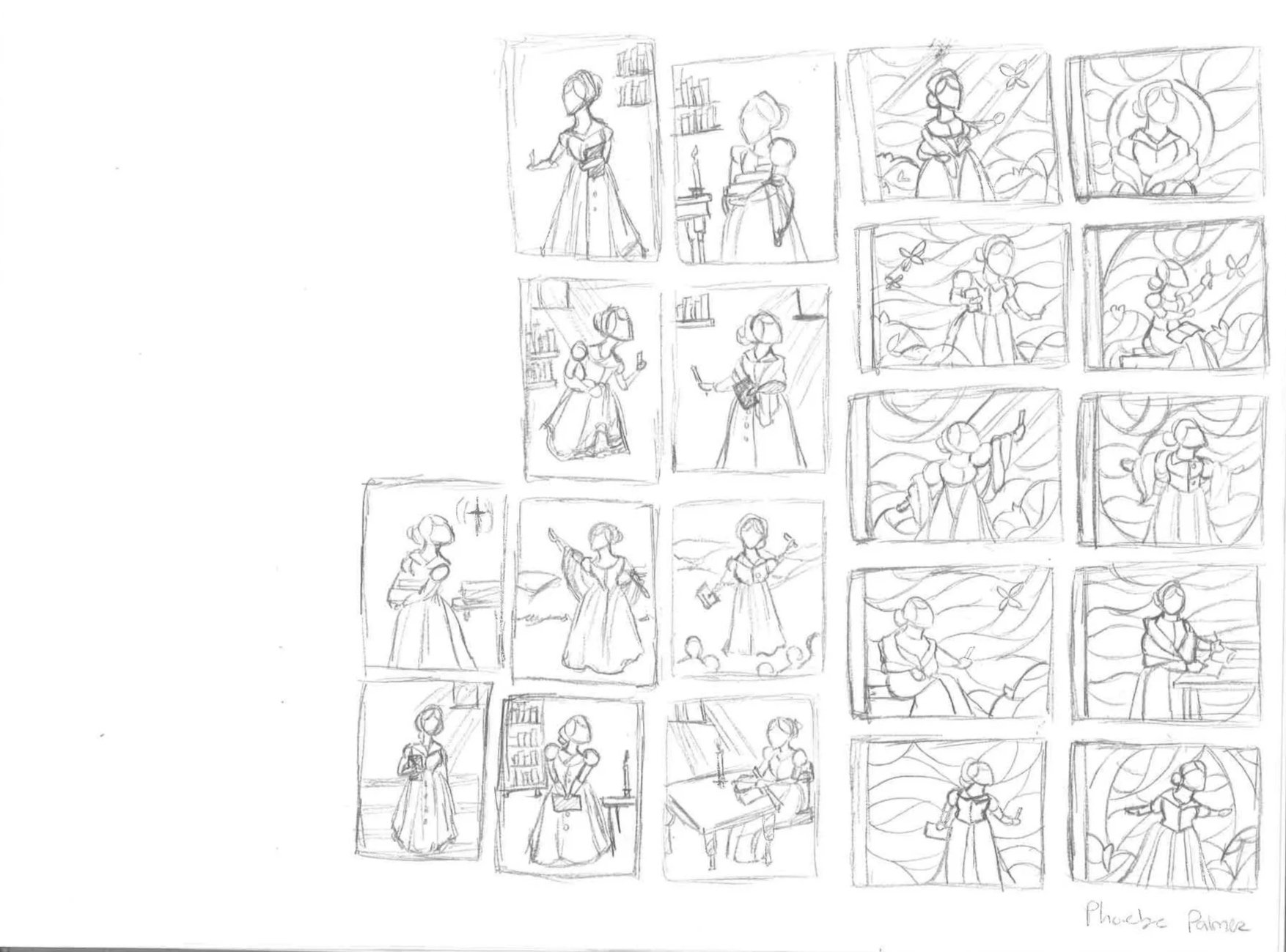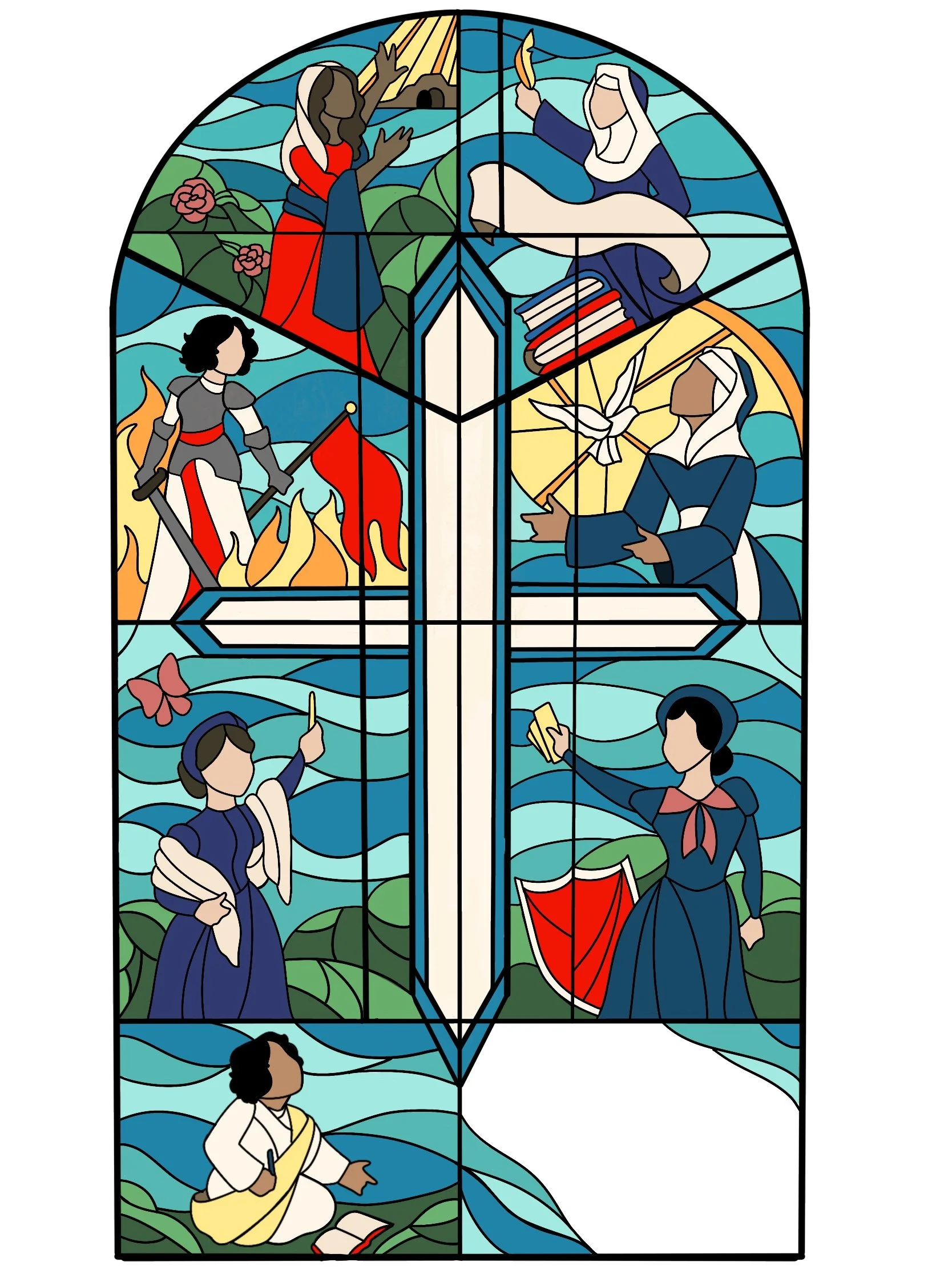 After completing some research on visual mediums throughout church history, I decided that my deliverables would include a large, faux “stained glass” frame depicting seven historical Christian matriarchs, accompanied by digital illustrations, and a 5x7 booklet describing their contributions to the Christian faith. From initial sketches to the final coats of cured resin, my goal for this solution was twofold: to encourage evangelical women through the retelling of others’ stories and to emphasize that all— regardless of gender—have a purpose in the Kingdom of God.